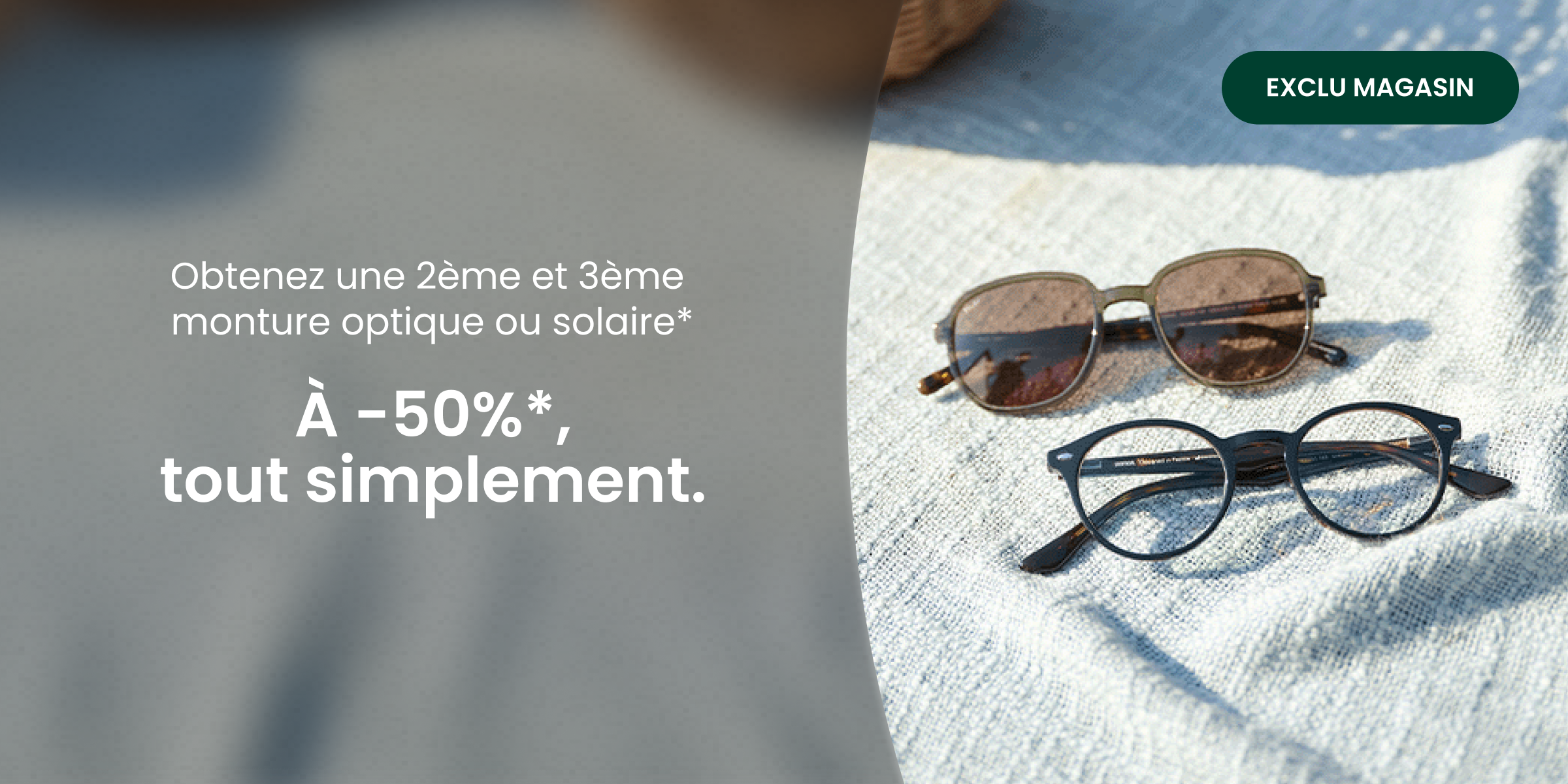 Votre 2ème monture optique ou solaire à -50%*, simplement.